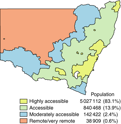 The Accessibility/Remoteness Index of Australia (ARIA) was used to determine remoteness.13 ARIA describes remoteness based on the road distance between a locality and general service centres of various sizes. We obtained ARIA values for each Local Government Area (LGA) in New South Wales and, given the relative rarity of cancer, created four discrete categories: highly accessible, accessible, moderately accessible, and remote (Box 1).