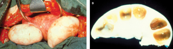 A: Polycystic ovaries, showing increased size and a smooth white surface reflecting thickening of the capsule. B: Section through polycystic ovary, showing multiple cysts with diameter < 10 mm arranged around the periphery of the ovary. The stroma is increased, and the ovary enlarged.