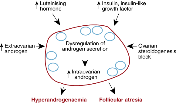 The pathogenesis of PCOS is poorly understood, but the primary defect may be insulin resistance leading to hyperinsulinaemia. In the ovary, the cardinal feature is functional hyperandrogenism (Box 3). Circulating concentrations of insulin and luteinising hormone (LH) are generally raised. The theca cells, which envelop the follicle and produce androgens for conversion in the ovary to oestrogen, are over-responsive to this stimulation. They increase in size and overproduce androgens. The rise in LH levels is thought to be caused by the relatively high and unchanging concentrations of oestrogens that may alter the control of this hormone by the hypothalamic–pituitary axis.