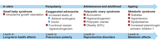 Fetal life. The condition may have its origins in fetal life, with either intrauterine growth retardation or post-term birth. Researchers have claimed that these children are more prone to hyperinsulinism, premature pubarche and signs of PCOS early in reproductive life. 9,10