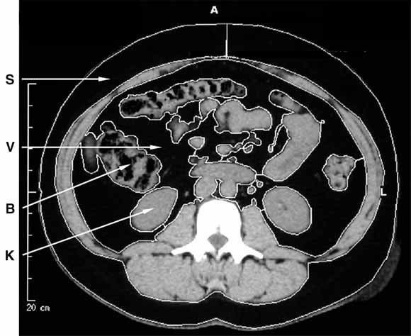 Computed tomography of the abdomen in polycystic ovary syndrome, showing subcutaneous (S) and visceral (V) fat, surrounding bowel (B) and kidneys (K).