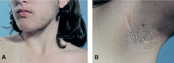 Young woman with PCOS showing facial hirsutism (A) and axillary acanthosis nigricans (B). The latter is associated with severe insulin resistance and hyperinsulinaemia and is an occasional finding in PCOS (photographs courtesy Dr John Casey, St Vincent’s Clinic, Sydney, NSW).