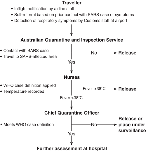 Three levels of border screening for SARS were introduced at Australian international airports on 5 April 2003 (Box 1). Based on the presence of respiratory symptoms, such as cough, shortness of breath and difficulty breathing, arriving travellers were referred by flight or airport staff for an initial screening by the staff of the Australian Quarantine and Inspection Service (AQIS). Travellers considered likely to have SARS on the basis of their travel history and symptoms were referred by AQIS staff to nurses stationed at the airports. The nurses assessed clinical symptoms, measured body temperature using an ear thermometer, and determined possible exposure to SARS based on the WHO case definition.6 At this stage, the traveller was either considered not to have SARS and released, or was referred to the Chief Quarantine Officer (CQO) of the respective state or territory for further assessment. The nurse telephoned the CQO, who then assessed the traveller in a room fitted with appropriate infection control measures.7 If the CQO concurred that SARS was a likely explanation for the illness, the traveller was then referred to a designated state or territory hospital for further assessment and management.