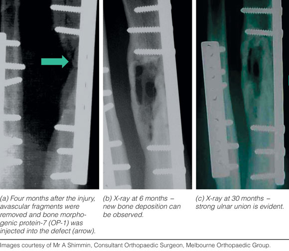 In 2002, it was shown that injecting recombinant human OP-1 into a bone non-union site resulted in healing of the non-union after 30 months.8 OP-1 acts by recruiting adult osteogenic precursor MSCs to repair the bone defects (Box 1). In an Australian study of 163 consecutive patients, including 113 patients with long bone fracture and in whom non-union occurred, OP-1 was used at a mean of 23.2 months after injury, with a follow-up of 19 months. Clinical bone union was achieved in 70% of patients, and radiological bone union in 65%; 35% of these patients had previous failed bone autografts. No significant adverse reactions were attributed to the OP-1 implant. There was also a decreased incidence of osteomyelitis at the surgical site, and bone donor site pain was eliminated, as reflected in decreased use of postoperative analgesia.8