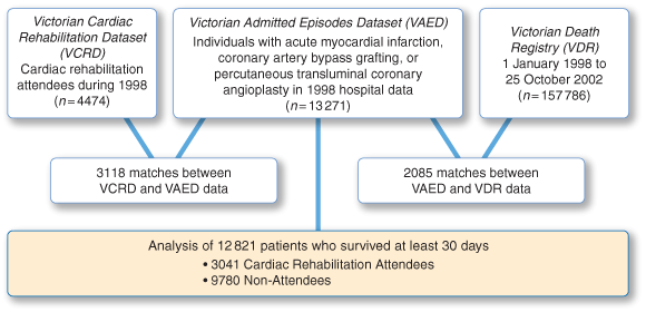 Box 1 shows the databases used and the linkages performed for data extraction. The Victorian Cardiac Rehabilitation Dataset is based on attendance data collected from 66 outpatient cardiac rehabilitation programs for the 12 months January to December 1998. For the purposes of this study, participation was defined as attending at least one session of a rehabilitation program. We estimate that 75% of these attendees completed a full 6–8-week program.