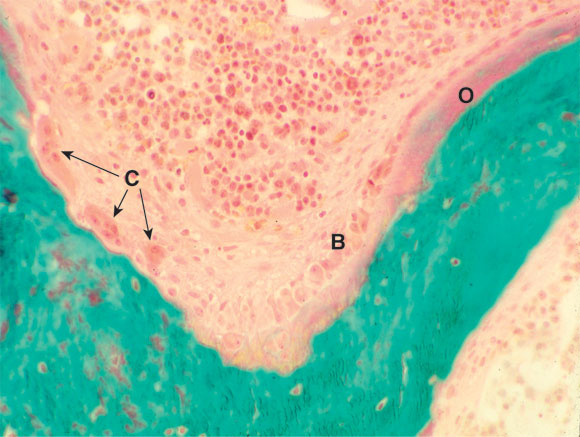 Section of bone, showing a bone remodelling unit with osteoclasts (C) resorbing bone and osteoblasts (B) laying down osteoid (O), which is beginning to mineralise. (Courtesy of Professor S Ott, University of Washington, Seattle, USA. http://courses.washington.edu/bonephys).