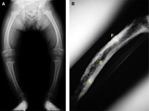 In children, decreased structural integrity of bone causes a variety of anatomical abnormalities, including genu valgum and genu varum (Box 3A), rachitic rosary (palpable bead-like enlargement of the costochondral junctions), craniotabes (areas of softening of the skull) and thickening of the wrists and ankles caused by metaphyseal widening. Proximal myopathy occurs in both children and adults, especially when vitamin D deficiency is prominent. Bone pain, often mistaken for osteoarthritis in adults, may be due to stress fractures that fail to heal (Looser’s zones), often in the pelvis and medial side of the femur.