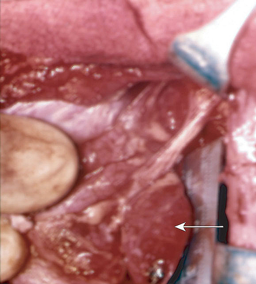 A single parathyroid nodule (arrow) is found at surgery in 85% of cases of hyperparathyroidism. Single nodules are unlikely to recur. Remaining cases are due to hyperplasia of more than one gland, which often recurs.