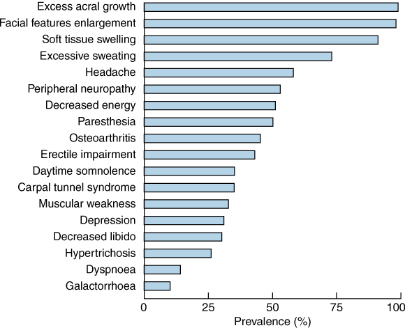 Acromegaly can very rarely be caused by ectopic secretion of growth-hormone-releasing hormone or growth hormone, but over 99% of cases are due to a growth-hormone-secreting pituitary tumour. The incidence of acromegaly is three to four cases per million per year, and the prevalence is 50–70 cases per million, with men and women equally affected. Acromegaly is more aggressive in younger people. The prevalence of clinical features is shown in Box 2. Sleep apnoea is a very common complication which improves with disease control.7 Mortality is increased 1.5 to 3 times in untreated acromegaly, and survival is reduced by 10 years.8 Prognosis is worsened by the presence of hypertension or cardiac disease. Treatment which reduces serum growth hormone level to < 2.5 μg/L, or serum IGF-1 level to the reference range, reduces mortality to that of the general population.9,10