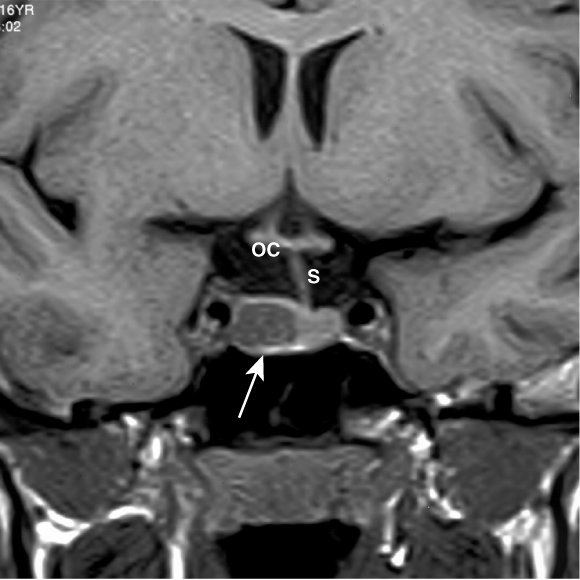 Management: An MRI scan (coronal view above) showed a 1 cm mass of low signal intensity within the right lobe of the pituitary gland (arrow), displacing the pituitary stalk to the left, characteristic of a small prolactinoma. Optic chiasm is labelled OC.