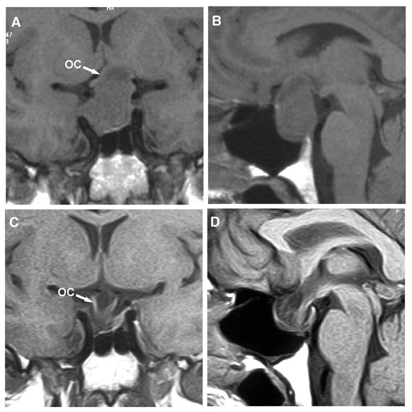 Magnetic resonance imaging in a 47-year-old man who presented with bitemporal visual field loss. (A, B) Before treatment with cabergoline, showing a large mass expanding the pituitary fossa, with substantial suprasellar extension elevating the optic chiasm (OC). (C, D) 6 months after starting cabergoline therapy (0.5 mg twice weekly), showing marked shrinkage of the mass, which is now entirely within the pituitary fossa, and decompression of the optic chiasm, which has descended into the fossa. The patient’s vision improved within a week of starting cabergoline. After 3 weeks, visual fields were almost normal, and serum prolactin level had fallen from 39 000 mU/L to 563 mU/L (reference range, < 330 mU/L).