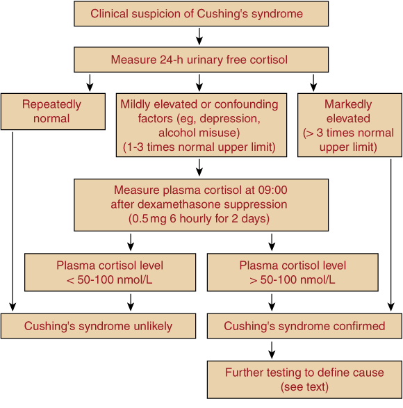 In patients with suggestive clinical features and no confounding factors (eg, illness, depression or alcohol dependence), a marked elevation of 24-hour urine free cortisol on several occasions is usually sufficient to diagnose Cushing’s syndrome. When diagnostic uncertainty remains, the patient should be referred for further investigations, including the 2-day low-dose (0.5 mg 6-hourly) dexamethasone suppression test, measuring plasma rather than urine cortisol for greater diagnostic accuracy.23 Suppression of 09.00 plasma cortisol level to less than 50–100 nmol/L makes Cushing’s syndrome unlikely, whereas higher levels are generally confirmatory. Midnight plasma cortisol level also provides excellent discrimination, but requires hospital admission.23