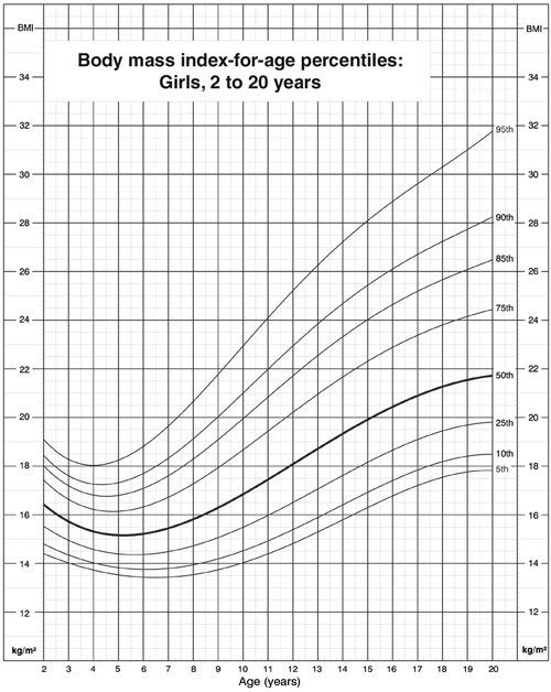 Adult BMI cut-off points cannot be used for assessing children and adolescents, as BMI varies throughout childhood, being high in the 2nd year of life, dropping to a nadir at age 4–7 years and then rising again to adult values (Box 3). BMI-for-age charts, such as those developed by the Centers for Disease Control and Prevention in the United States,6 can be used in clinical practice to assess and monitor BMI over time in children (Box 3). Overweight is defined as BMI between the 85th and 95th percentiles, and obesity as BMI > 95th percentile,7 but these definitions are arbitrary, as, unlike adult BMI cut-offs, they are not linked to morbidity data. Although a table of age- and sex-specific cut-offs developed for epidemiological research8 allows international comparison of trends in overweight and obesity in children, it is not intended for routine clinical use.