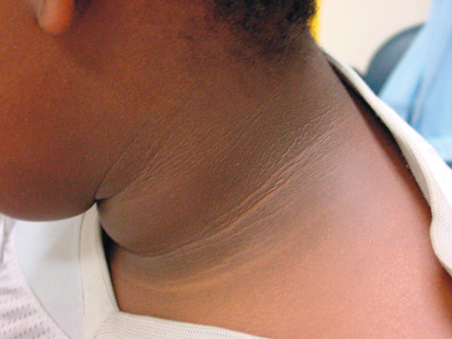 Acanthosis nigricans is thought to be a clinical marker for hyperinsulinism (Box 1). Detection in subtle cases may be difficult, so it is possible that more than 72% of our patients had this skin finding. Acanthosis nigricans may be a useful screening tool for type 2 diabetes in obese children.