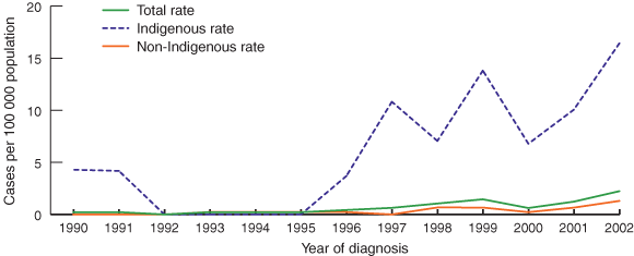 During the study period, there was an average annual increase of 27% in the unadjusted overall rates of type 2 diabetes (incidence rate ratio, 1.27; 95% CI, 1.15–1.41). This increase was highly significant in both the Indigenous and non-Indigenous groups (Box 2). Overall, the rates were higher in the Indigenous population compared with the non-Indigenous population.