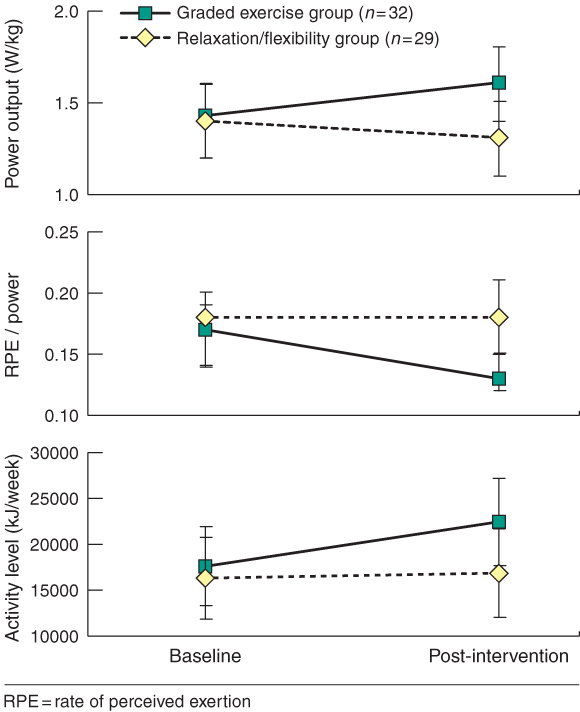 Limitations of the study relate to the use of a relaxation/flexibility control group rather than a control group that experienced no intervention, and neither subjects nor the exercise physiologist were blinded to the intervention. Additionally, 12 weeks may not have been long enough to maximise changes. Further studies that include a longer intervention period and a formal follow-up would provide valuable information in this debilitating disorder.