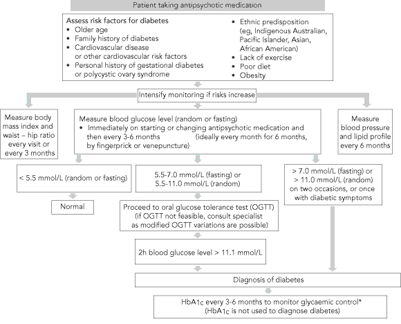 An algorithm for monitoring glucose metabolism in people treated with antipsychotic medication is shown in Box 3. Ideally, fasting or random blood glucose levels should be assessed monthly for 6 months after initiating or changing antipsychotic therapy, then at least twice yearly. In cases where there are repeated changes in the antipsychotic medication or dose, clinical judgement on appropriate glucose monitoring will be required. In any case, blood glucose measurements should be obtained a minimum of twice yearly. Laboratory blood glucose measurements or finger-prick measurements using a blood glucose meter are acceptable.
