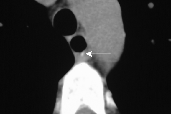 The only abnormality in the patient’s blood tests was a mildly elevated white cell count of 11.7 3 109/L (reference range, 4.0–11.0 3 109 cells/L). An electrocardiogram and chest x-ray were normal. These initial investigations ruled out a cardiovascular condition, spontaneous pneumothorax, peptic ulcer disease and pancreatitis. The differential diagnosis was oesophageal pathology, including perforation. A computed tomography (CT) scan of the thorax showed a tiny bubble of gas either within the wall of the oesophagus or just adjacent to it in the middle mediastinum (this did not definitively exclude a full perforation of the oesophagus).