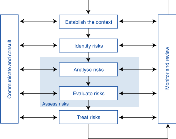 The Risk Management Standard defines the core principles of risk management (Box 1). It is a continuous process that establishes the context, identifies, analyses, evaluates, and treats the risk. The process is undertaken within a framework of ongoing communication, consultation, monitoring and review. The risk can be either accepted or treated in one of four ways: by reducing the likelihood, minimising the consequences, transferring in part or full, or avoiding.