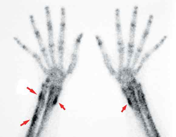 A 28-year-old woman presented with a 3-month history of wrist and ankle pain, lethargy and weight loss. She had clubbing of the fingers (Box 1) and toes. A bone scan (Box 2) and chest x-ray (Box 3) revealed periostosis in the wrists and pulmonary metastases, respectively. Two years earlier she had been diagnosed with a malignant phyllodes tumour of the left breast (Box 4), which was treated by mastectomy and axillary dissection.