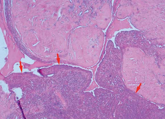 Phyllodes tumours are fibroepithelial lesions arising from intralobular breast stroma. They account for less than 1% of breast neoplasms. Treatment is by surgical resection. About 20% of patients with phyllodes tumours develop distant metastases, and long-term survival in these women is rare.2