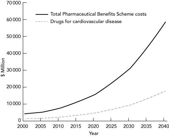 The projected growth in total PBS subsidies and subsidies for drugs to treat CVD over the 40-year period of the IGR are shown in Box 4. The annual cost of the PBS is predicted to increase almost 14-fold, from $4.26 billion to $58.5 billion. The cost of drugs for CVD is predicted to increase from $1.29 billion to $17.7 billion per year by 2041–42.