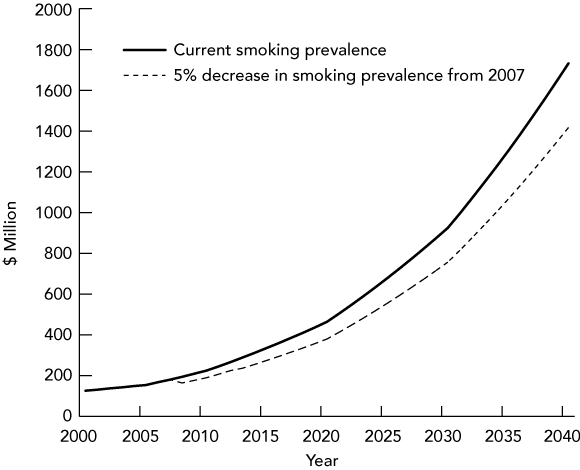 Main outcome measures: Estimated smoking-related PBS subsidy costs in 2001–02 and predicted cumulative subsidies until 2041–42, under current and reduced smoking prevalence assumptions.