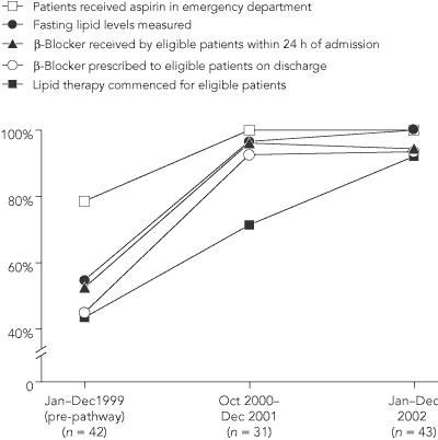 The key process measures selected for the ST-elevation AMI pathway were the proportions of (a) patients who received aspirin in the emergency department or before presentation; (b) eligible patients who received a β-blocker within 24 hours of admission; (c) patients whose fasting lipid levels were measured on the first day of admission; (d) eligible patients (ie, those with total cholesterol level > 4mmol/L) who commenced lipid-lowering therapy; and (e) eligible patients who were prescribed a β-blocker on discharge.