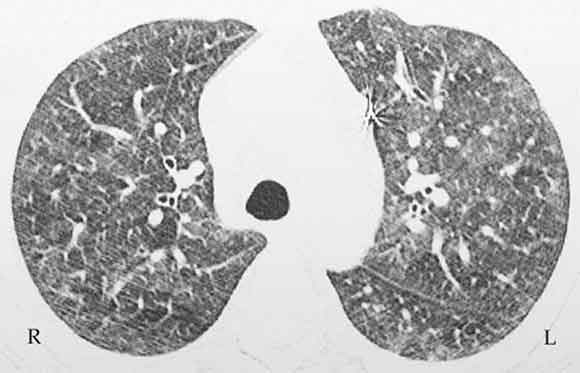 A chest x-ray demonstrated bilateral ground glass infiltrates, predominantly in the basal zones. High-resolution computed tomography (CT) of the chest revealed bilateral patchy ground glass opacities (Box 1). Spirometry showed a forced vital capacity (FVC) of 65% predicted, a forced expiratory volume (FEV1) of 68% predicted, and FEV1/FVC of 104%. An echocardiogram was normal. A nerve conduction velocity study showed axonal involvement, with reduced nerve conduction velocity in the right radial and left superficial peroneal nerves. CT of the paranasal sinuses showed chronic pansinusitis. Histopathological examination of the open-lung biopsy showed leukocytoclastic vasculitis, granuloma formation, and extravascular eosinophilic infiltration (Box 2). Renal biopsy showed pauci-immune, crescentic glomerulonephritis. Renal vessel Doppler ultrasonography and renal angiography gave normal results and ruled out any renal vessel involvement. The patient tested positive for perinuclear antineutrophilic cytoplasmic antibodies (ANCAs) and negative for cytoplasmic ANCAs by the indirect immunofluorescence method. A more specific enzyme-linked immunosorbent assay (ELISA) for anti-myeloperoxidase was positive, and another, for anti-proteinase 3, was negative. These tests ruled out Wegner’s granulomatosis. Antinuclear factor, anticardiolipin antibodies, hepatitis B surface antigen, and serological tests for hepatitis C and HIV were negative, thus ruling out significant secondary causes of vasculitis.