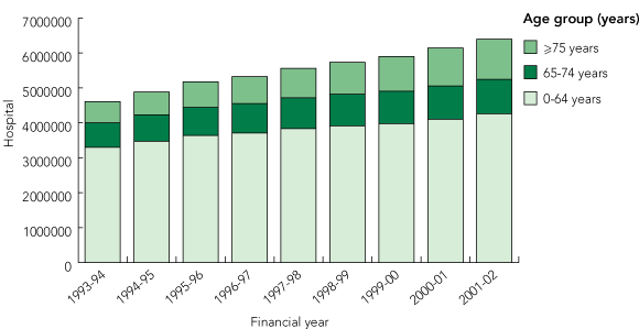 In the period 1993–94 to 2001–02, total hospital separations increased by 39%, from 4.61 million (m) to 6.39 m. The proportion of separations of people aged ≥ 65 years increased progressively from 28% (1.31 m) to 33% (2.13 m). All of this increased proportion was attributable to growth in separations in the patient group aged ≥ 75 years, rising from 13% to 18% of all admissions (Box 1). Separations in the patient group aged ≥ 75 years rose from 0.61 m to 1.15 m (89%), compared with 0.70 m to 0.99 m (41%) in the patient group aged 65–74 years.