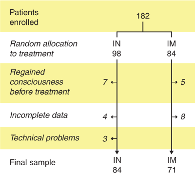 Of the 182 patients initially enrolled in the study, 27 patients were not included in the final cohort (see Box 1), leaving 155 patients in the final sample, 71 of whom received IM naloxone and 84 of whom received IN naloxone.