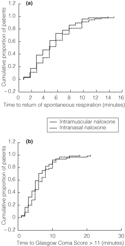 Design: Prospective, randomised, unblinded trial of either 2 mg naloxone injected intramuscularly or 2 mg naloxone delivered intranasally with a mucosal atomiser.
