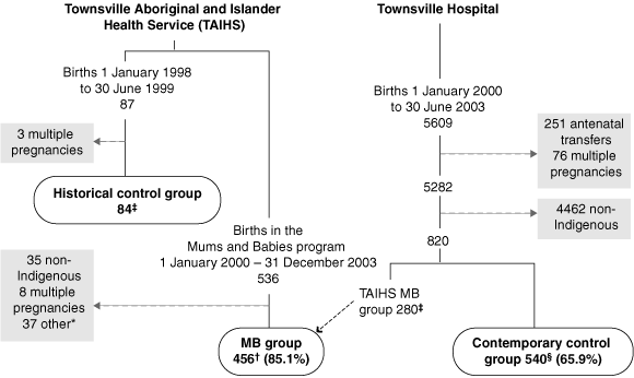 Design and participants: Prospective cohort study of women attending Townsville Aboriginal and Islander Health Service (TAIHS) for shared antenatal care with a singleton Indigenous birth between 1 January 2000 and 31 December 2003 (456 women; the MB group), compared with a historical control group of 84 women who attended TAIHS for antenatal care before the intervention between 1 January 1998 and 30 June1999, and a contemporary control group of 540 women who had a singleton birth at Townsville Hospital between 1 January 2000 and 30 June 2003, but did not attend TAIHS for antenatal care.