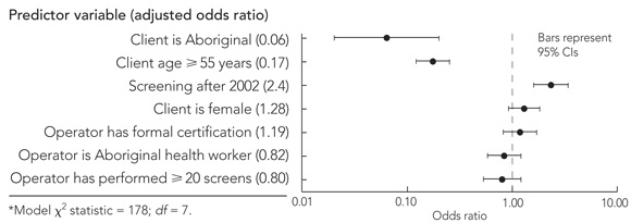 Data were analysed using SPSS version 6.1.3 (SPSS, Chicago, Ill).9 For univariate analysis, results are presented as proportions of available data and their confidence intervals, calculated using a normal approximation. Bivariate relationships were examined using χ2 tests. Explanatory variables were considered for entry into a logistic regression model of screening quality based on bivariate relationships and clinical interest.