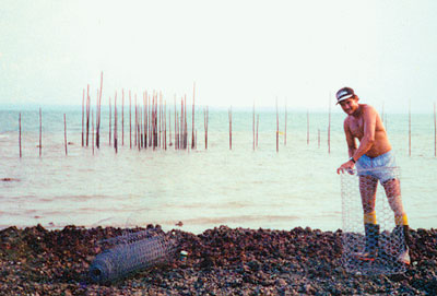 Donald (“Dookie”) Bonson using chicken-wire to make baskets to carry the fish. Fish trap in background.
