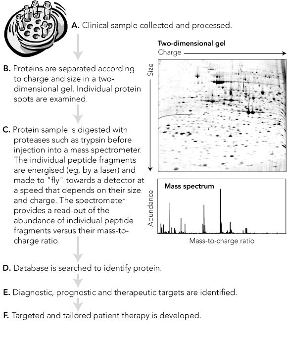 As genomics (the study of genes) has proven inadequate to predict the structure and dynamic properties of all proteins, a new field — proteomics — has developed (Box 1). This is the large-scale study of protein expression, structure and function. It aims to correlate the structural and functional diversity of proteins with underlying biological processes, including disease processes. Proteomics has created opportunities to identify, investigate and target proteins that are differentially expressed in health and disease. Clinical research is poised to benefit enormously from these studies, with the potential to develop better diagnostic and prognostic tests, to identify new therapeutic targets and ultimately to allow patient-individualised therapy.1,2