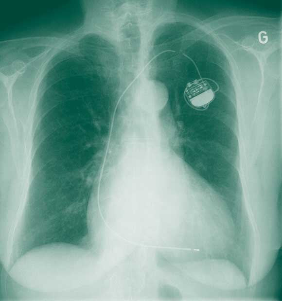 Routine chest x-rays should be performed to monitor the condition of pacemaker leads, especially where they cross the clavicle. We recommend an annual chest x-ray for pacemaker-dependent patients. This may identify lead damage that may not be apparent during a standard pacemaker check, and thus, potentially, avoid syncope or sudden death.