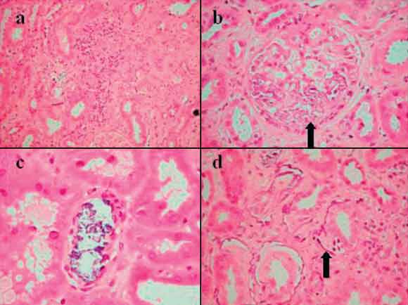 Six of 27 glomeruli were totally sclerosed and there was widespread interstitial fibrosis with tubular atrophy and interstitial lymphocytosis (a). Calcification was seen in glomerular basement membranes (b, arrow), within tubule lumens (c) and in tubular basement membranes (d, arrow). There was also intimal thickening of interlobular arteries, indicating arteriosclerosis and there were no significant abnormalities on immunofluorescence or electron microscopy. (Haematoxylin and eosin stain; original magnifications (a) × 40, (b) and (d) × 100, (c) × 200.)