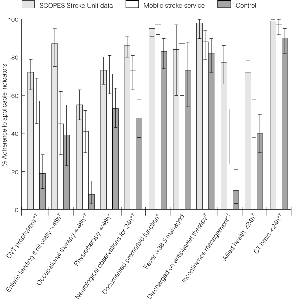 Adherence to most quality indicators was better after instituting the MSS compared with the control period (Box 2). Compared with stroke units, adherence in our MSS was lower for early allied health assessments, incontinence management, fever management and appropriate use of antiplatelet therapy.