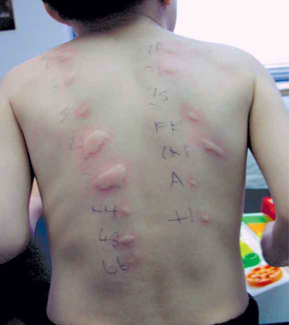 A skin prick test, showing multiple weal and flare reactions to common allergens in an atopic child with eczema.