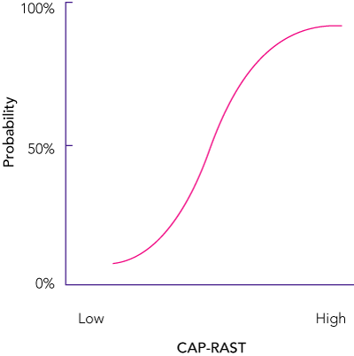 Food-specific IgE level (measured by ImmunoCAP-specific IgE blood test) and probability of reacting to that food after challenge.