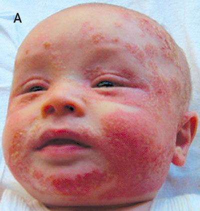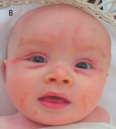 A: A 4-month-old boy with extensive eczema responded poorly to topical treatment, including corticosteroids. Exclusively breast fed, he had not yet commenced solids. Skin prick testing produced an 8-mm weal to egg protein and a 6-mm weal to cow’s milk protein, but was negative for peanut, wheat, soy and fish. Topical treatments were continued, and egg and cow’s milk were excluded from his mother’s diet under dietetic supervision. B: Child’s appearance 6 weeks later.