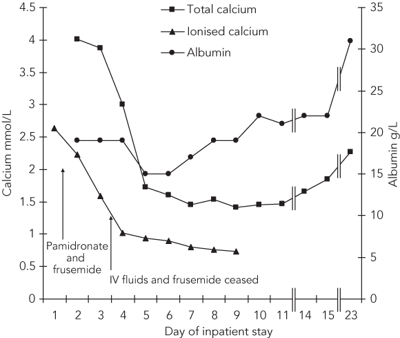 The patient’s hypercalcaemia was managed by intravenous administration of saline, followed by frusemide and pamidronate 90 mg. Over the next few days, her condition improved and her blood pressure and renal function normalised. The hypercalcaemia resolved quickly — to the extent that, by Day 8, she had developed symptomatic hypocalcaemia requiring oral supplementation with calcium carbonate and calcitriol (Box 2).