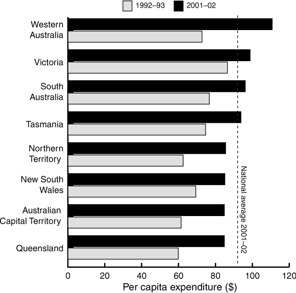 1 Per capita expenditure on specialised mental health services by states and territories, 1992–93 and 2001–02