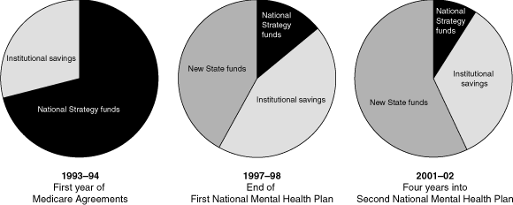 Under the Mental Health Strategy, the size and number of stand-alone psychiatric hospitals continued to decline, but with agreement that they be replaced by acute beds in general hospitals and a range of community-based services, including residential accommodation. Another difference from the situation in the period before the strategy was implemented was the requirement for states and territories to maintain or increase their mental health budgets (a “maintenance of effort clause” in the Health Care Agreements), though this requirement was only for the life of the First and Second National Plans (1993–2003). While increasing in actual dollar terms, the relative role of federal funding, which allowed states and territories to establish community and other services, has decreased over time and more of the new services are being funded by states and territories (Box 2). For every federal dollar allocated to states and territories under the Strategy, combined state and territory funding of mental health increased by $4.60.6