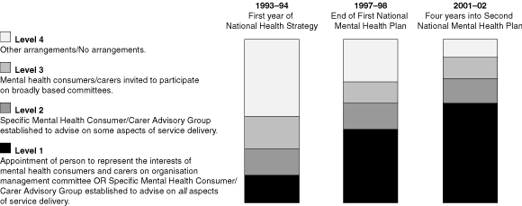 Involving consumers and carers in service delivery and planning was also a key part of the National Strategy. Federal funding was contingent on the establishment of community advisory groups in every jurisdiction. While this was initially done as a token gesture in some services to secure funding, it has, over time, become more accepted, and participation rates of consumers and carers have increased considerably (Box 4).