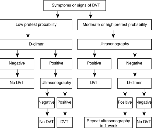 • A low clinical pretest probability of DVT and negative D-dimer result reliably exclude the diagnosis, with no need for diagnostic imaging.