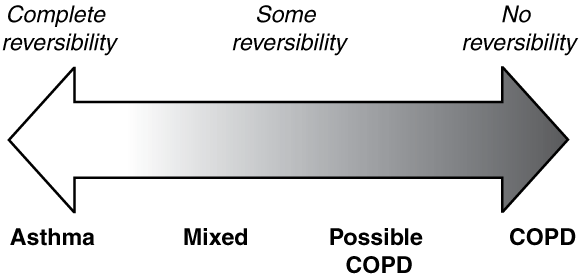 Many older people have both a reversible and a non-reversible component of their lung disease.7 The importance of each component will vary depending on the mix of lung insults over each patient’s lifetime, and they are only relevant when treating patients at the extreme ends of the spectrum. However, the overlap is important when trying to interpret epidemiological studies derived from symptom questionnaires. We need to know whether, in older people, lung disease with airflow obstruction would be better characterised as a syndrome caused by a spectrum of disease, with asthma at the reversible end and chronic obstructive pulmonary disease at the non-reversible end (see Box 1).