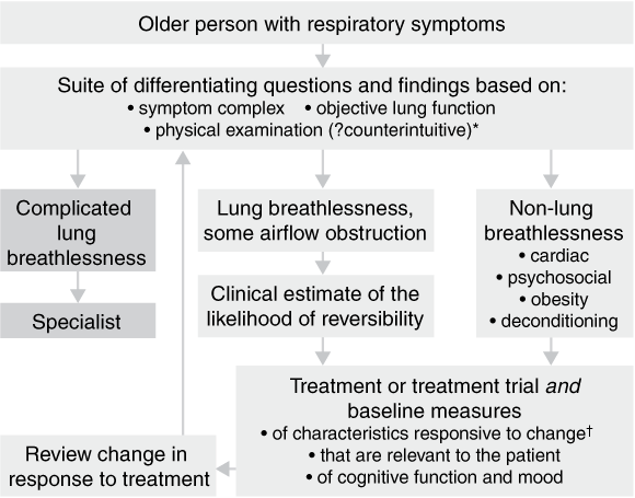 How should physical examination be targeted? A number of reviews of the diagnosis of asthma in older people have included exhaustive lists of relevant physical examinations.2,5-8 However, the extent of these examinations limits their value in practice. Considering the lack of specificity of breathlessness in older people, it may be more efficient to examine for non-respiratory causes if the presenting symptoms are predominantly respiratory, and vice versa.