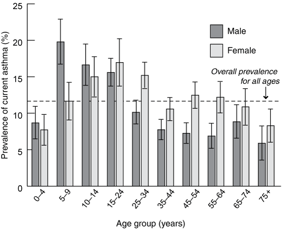 In 2001, the prevalence of current asthma among people aged over 55 years was 7.3% for men and 10.7% for women (Box 1). These data are derived from the National Health Survey6 and refer to individuals who report that they have had asthma diagnosed by a doctor, and that they still have it. The prevalence of asthma is similar among all adult age groups, but is lower in adults than in children. It is not yet clear whether this is attributable to remission of asthma with age or to the higher incidence of asthma in more recent birth cohorts.